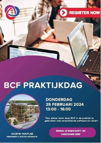 “Op de BCF Praktijkdag gaat u in de praktijk aan de slag met BCF. U ontdekt nieuwe, innovatieve toepassingen en/of leert werken met directe communicatie. U gebruikt uw eigen hard- en software, werkt in virtuele projectomgevingen en ontdekt nieuwe platforms. De BCF Praktijkdag is voor iedereen. Zowel startende als gevorderde BIM-gebruikers zijn welkom.”