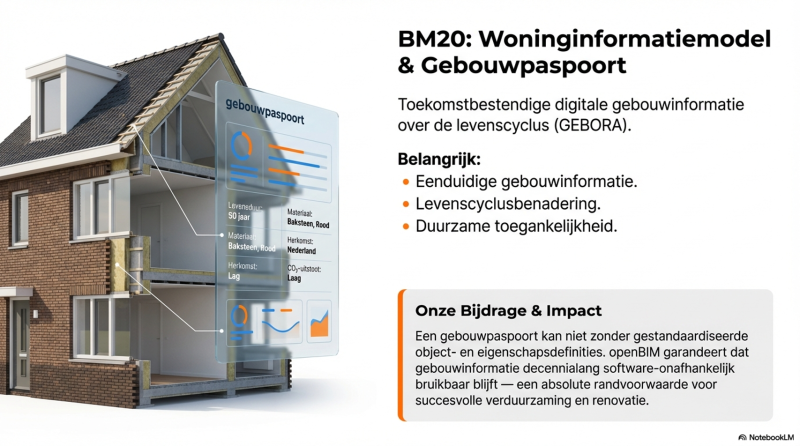 Een gebouwpaspoort vraagt om gestandaardiseerde object- en eigenschapsdefinities. OpenBIM en internationale datamodellen maken het mogelijk om gebouwinformatie software-onafhankelijk en langdurig bruikbaar te houden — essentieel voor verduurzaming en renovatieopgaven.
