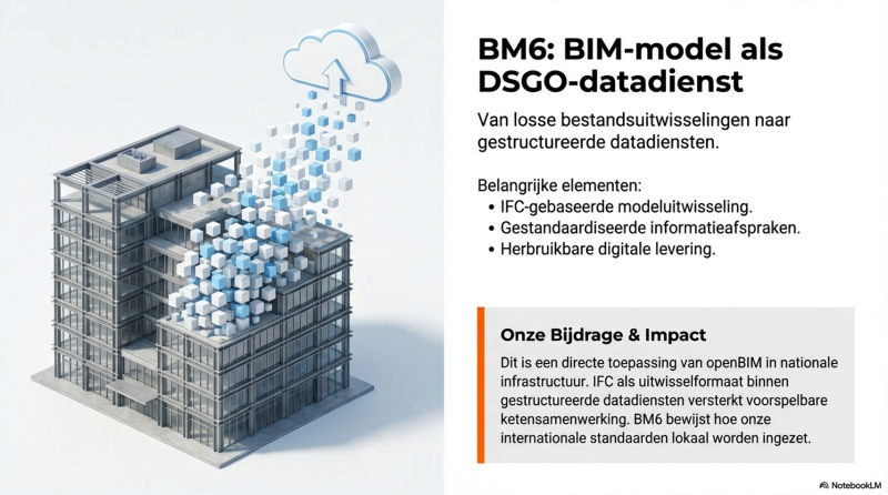Dit is een directe toepassing van openBIM in nationale infrastructuur. IFC als uitwisselformaat en gestructureerde datadiensten versterken de positie van open standaarden in de praktijk. BM6 laat zien hoe internationale standaarden lokaal kunnen worden ingezet voor voorspelbare ketensamenwerking.