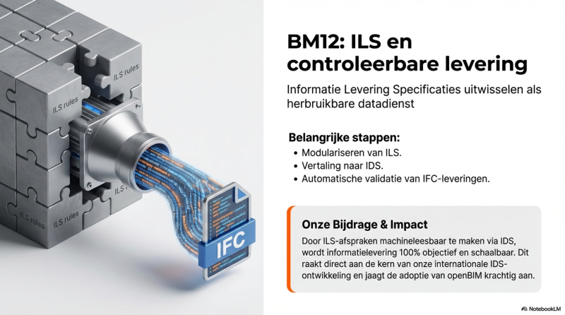 BM12 raakt direct aan de internationale ontwikkeling van IDS binnen buildingSMART. Door ILS-afspraken machineleesbaar en toetsbaar te maken, wordt informatielevering objectief en schaalbaar. Dit versterkt de internationale adoptie van openBIM-standaarden.