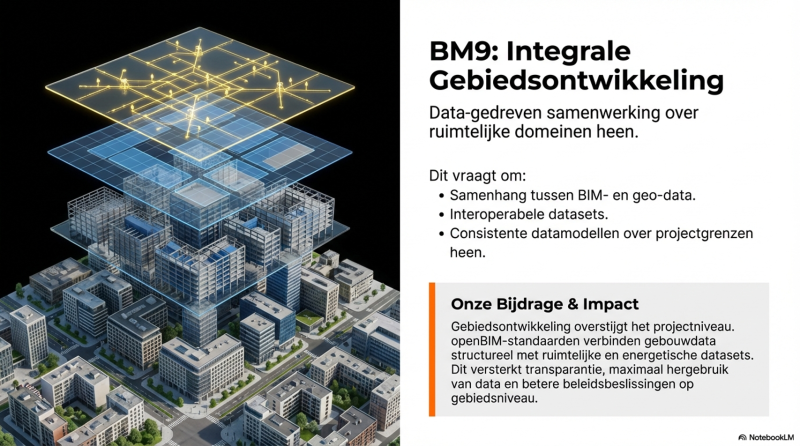 Gebiedsontwikkeling overstijgt projectniveau. OpenBIM-standaarden maken het mogelijk om gebouwdata structureel te verbinden met ruimtelijke en energetische datasets. Dat versterkt transparantie, hergebruik en besluitvorming op gebiedsniveau.