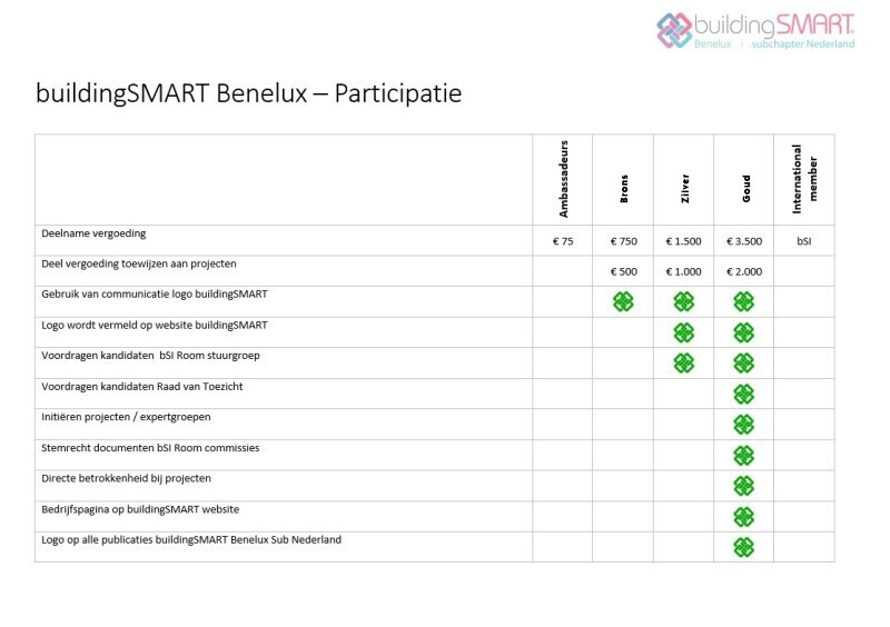 buildingSMART Benelux Subchapter Nederland vraagt in ruil voor deelname een jaarlijkse bijdrage.